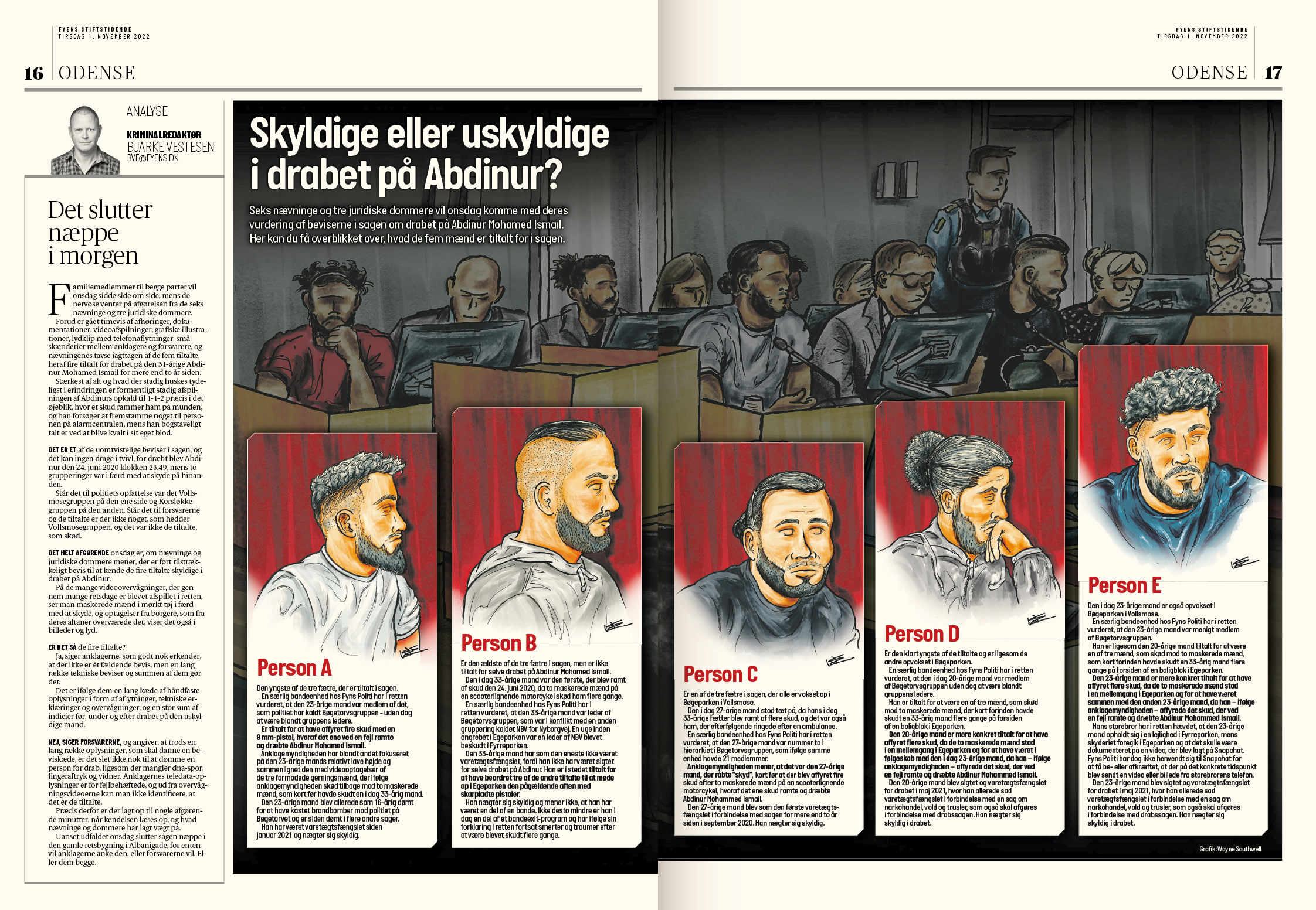Retstegninger af anklagede i mordsag. Illustration: Wayne Southwell